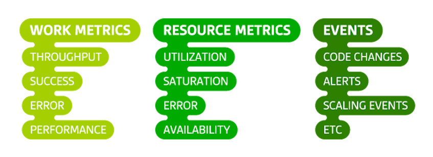 These metrics are incredibly important for observability. They are the big, broad-stroke measures that can help you quickly answer the most pressing questions about a system’s internal health and performance: is the system available and actively doing what it was built to do? How fast is it producing work? What is the quality of that work?