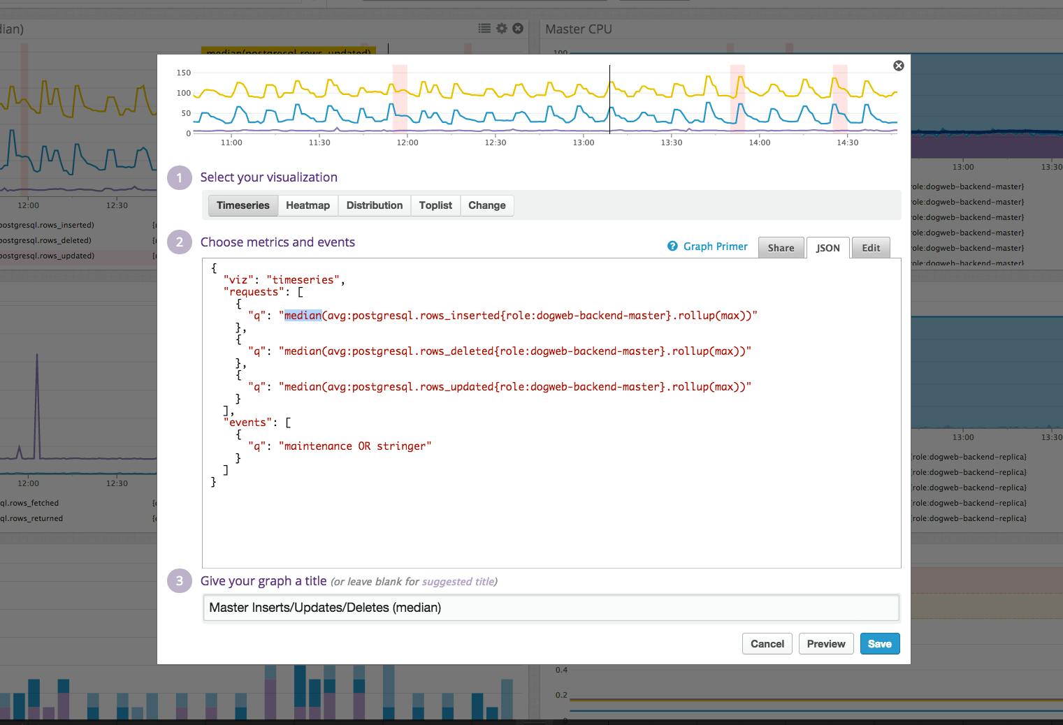 Drag and drop graphs and other widgets to visualize metrics and events: