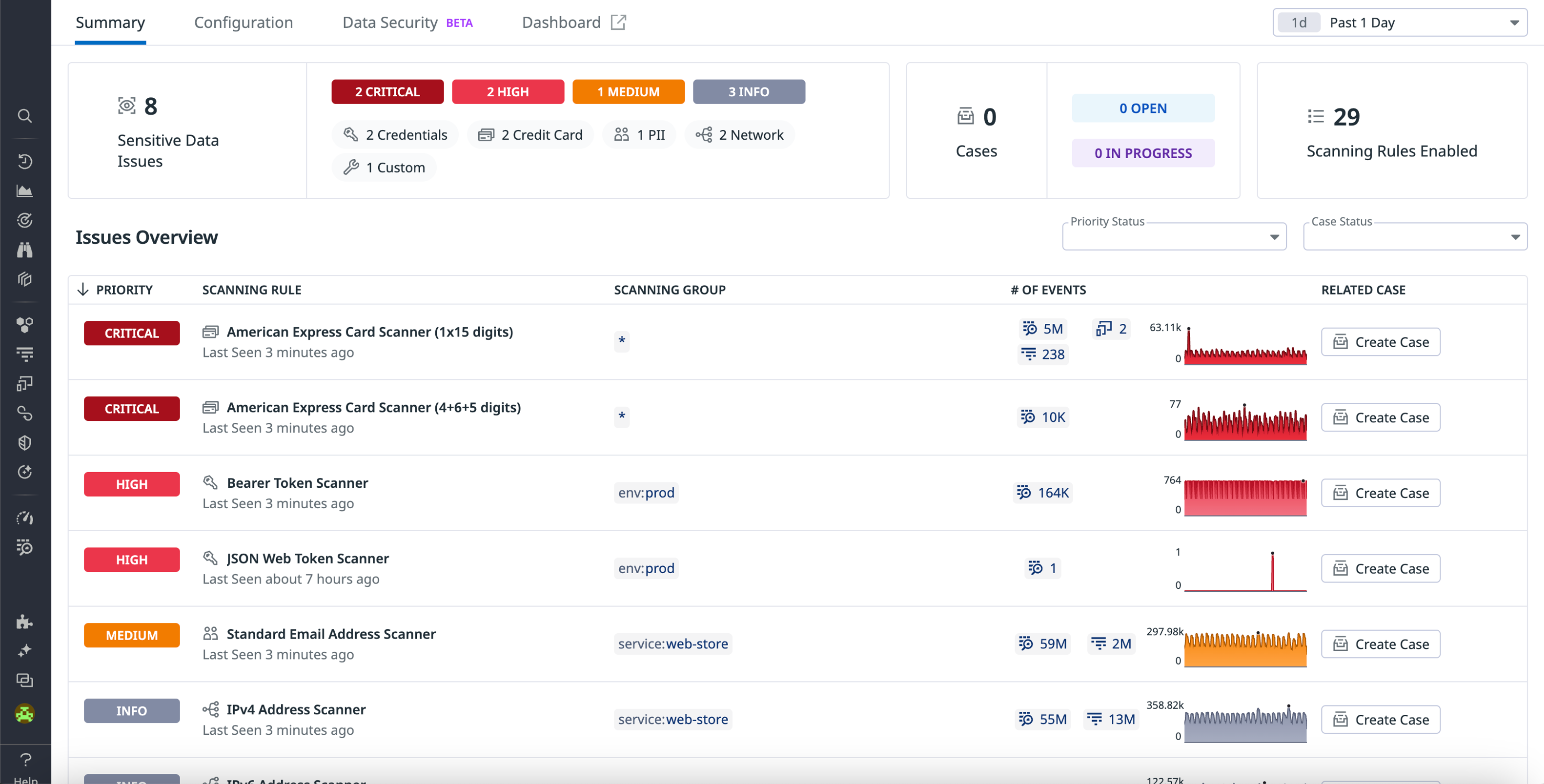 In distributed applications, data flows across numerous loosely connected endpoints, microservices, and teams, making it challenging to determine when services are storing—or inadvertently leaking—sensitive information. Datadog’s Sensitive Data Scanner helps you discover, classify, and redact sensitive data across your telemetry so you can enforce data security and compliance.