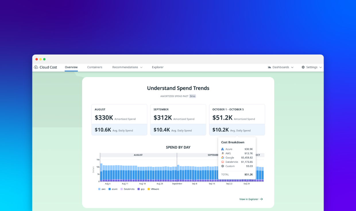 In cloud-based applications, the cost of any given service often comes down to a wide range of dynamic factors, and keeping track of these costs as applications evolve and teams scale can mean reckoning with the intricacies of many different billing models. Datadog Cloud Cost Management provides near real-time visibility into your total cost of ownership - from cloud and SaaS providers to custom cost uploads - allowing you to put costs in front of teams and optimize your resources in a matter of minutes.